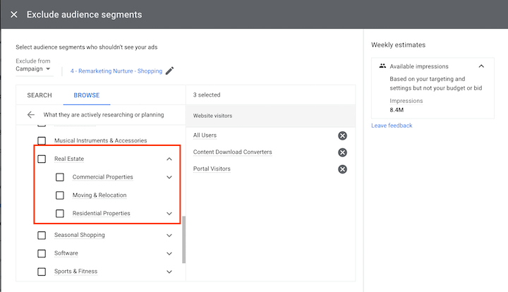 受众排除是一种未充分利用的策略,可以节省预算并更有针对性地发送消息。设置受众排除对象遵循与否定关键字和排除展示位置相同的逻辑:排除的受众群体中的任何人都没有资格看到您的广告。