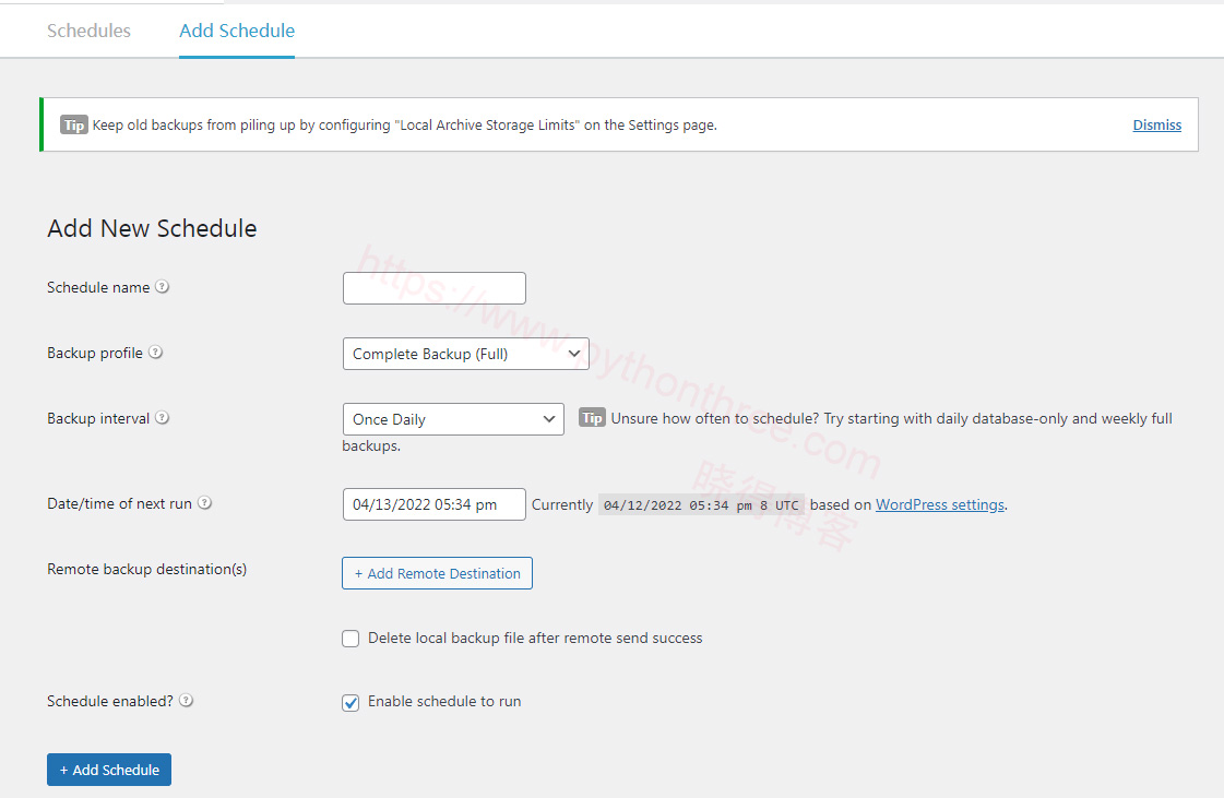 BackupBuddy插件-Schedules备份计划部分,可以设置备份计划的名称,备份配置文件选项,备份间隔时间,下次备份日期,远程备份目的地,并开启自动运行计划。