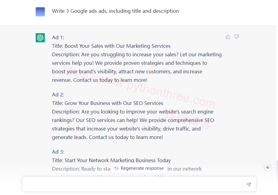 ChatGPT 能够为您的广告或销售页面创建完整的副本。如果您不满意,只需要求生成另一个响应即可,将拥有全新的有说服力的文字!