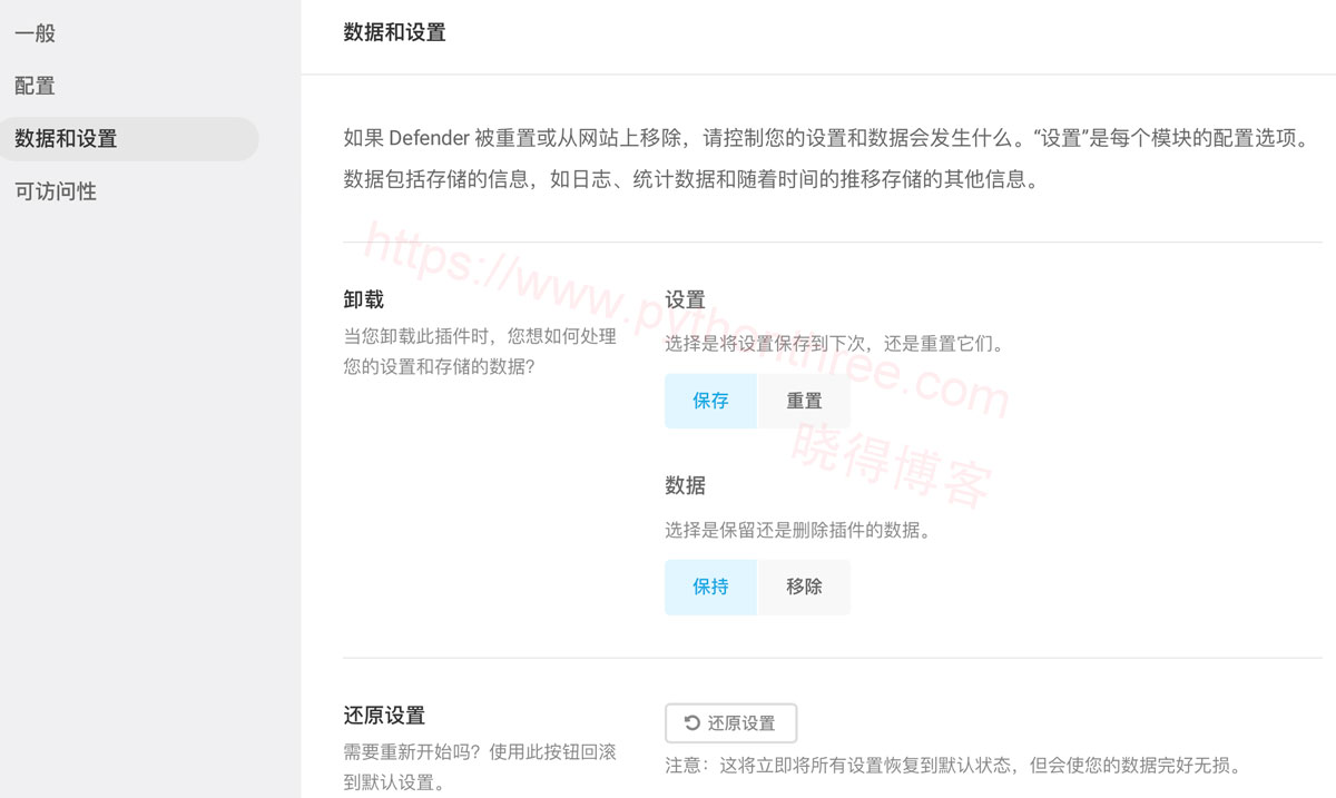- 数据和设置:如果 Defender 被重置或从网站上移除,可“设置”是每个模块的配置选项。