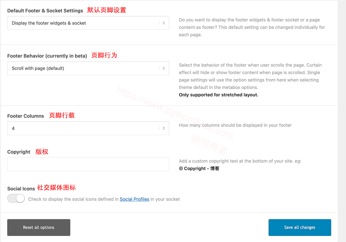 在 footer 页脚设置中,不仅可以设置网站页面的页脚和版权,也可以设置页脚的行为,页脚的行数,以及自定义页面作为页脚。