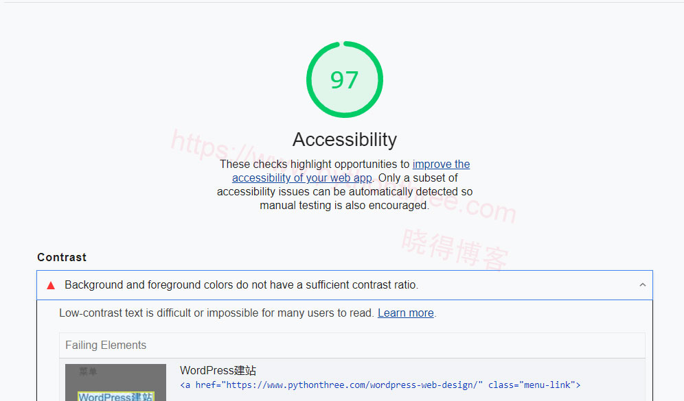 此分数可让您了解您的网站的可访问性。在大多数情况下,您需要在此方面获得高分。该工具确实注意到它只能检测网站的某些可访问性方面,并且最好进行手动审核。