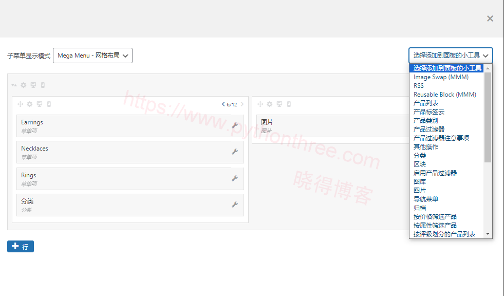 大型菜单网格布局可让您在多列和行中创建菜单。同时,您只能在使用标准布局时更改列数。通过单击选择要添加到面板的小部件,添加丰富的内容,使您的菜单更具视觉吸引力。然后,从下拉列表中选择一个小部件,包括搜索栏、图片库、日历、音频内容、视频和产品过滤器。