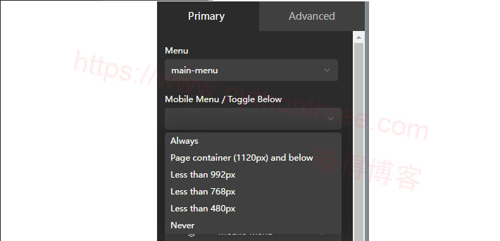 - 移动菜单/下方切换——选择您希望看到显示的移动菜单(汉堡菜单)的断点。
